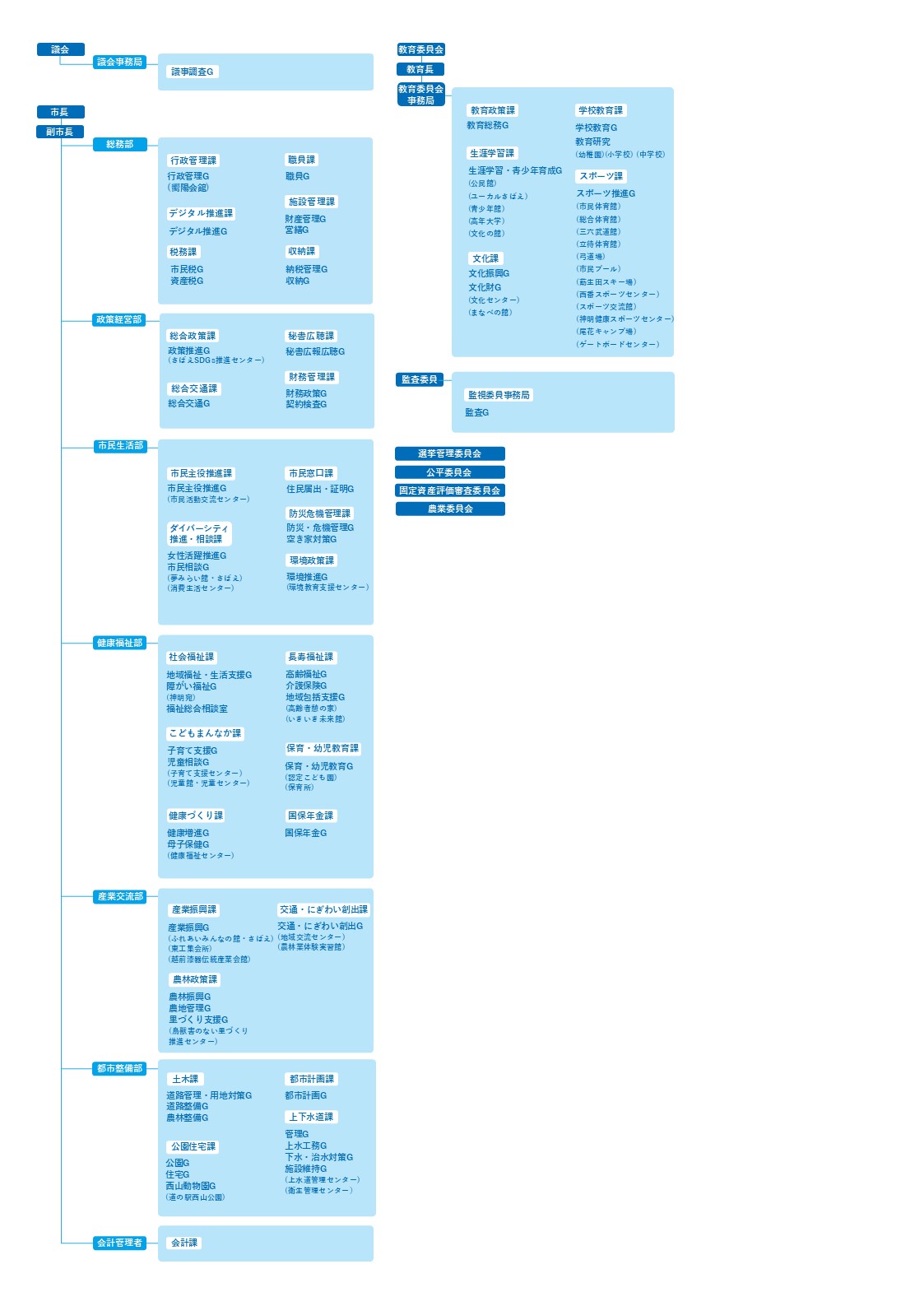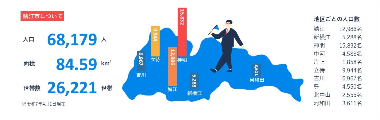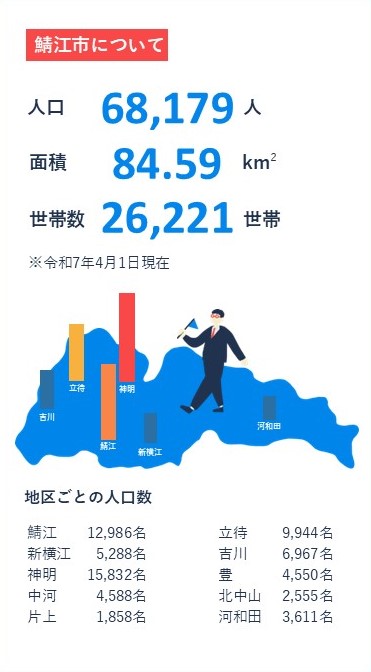 鯖江市の人口、面積、世帯数や、鯖江市役所の組織図など、鯖江市に関する基本情報をご紹介します。